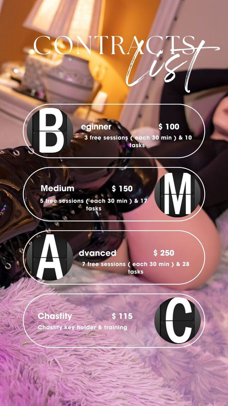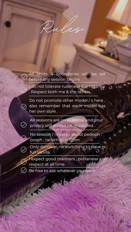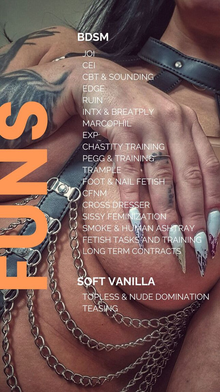 - fastresponse, bdsm, mistress, lush, piercing, tattoos, femdom, smoke, tease, leather, strapon, findom, fetishes, longnails, softvanilla, longterm, nakednude, directpayment, highboots, goodenglish, trainingsession