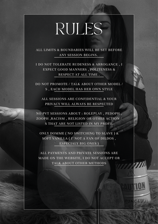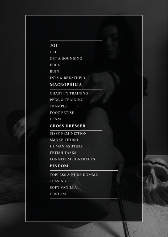- fastresponse, bdsm, mistress, lush, piercing, tattoos, femdom, smoke, tease, leather, strapon, findom, fetishes, longnails, softvanilla, longterm, nakednude, directpayment, highboots, goodenglish, trainingsession
